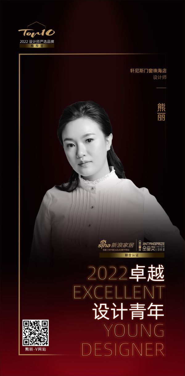 “2022卓越设计青年”由新浪家居和金堂奖全国联盟发起,是设计业界最具传播价值的年度先锋荣誉,新浪家居与金堂奖联名认证。旨在发掘和表彰室内设计领域表现卓越的杰出青年设计师。设计师熊丽荣膺“2022卓越设计青年”称号。