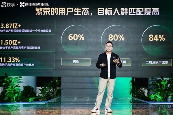 过去一个月,快手“房产”相关关键词搜索次数达3.87亿,快手高潜房产用户达1.5亿,其中60%是男性,80%以上是24岁以上人群,二线及以下城市人群占比84%。纪新军分析称:“这些房产潜在用户里87%是使用快手超2年的老粉丝,他们都是非常有潜力的购房潜在用户。”