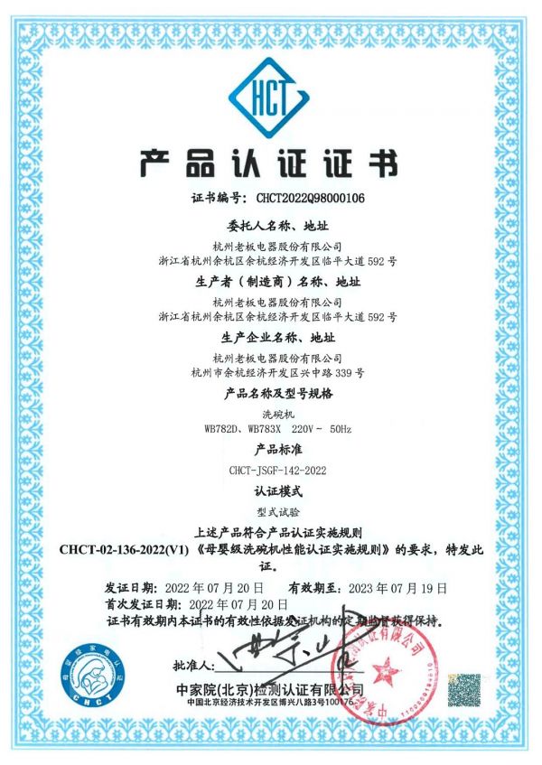 相比普通洗碗机,老板母婴级洗碗机WB782D新增深层紫外照射除菌功能,餐具经过UV紫外线照射可穿透微生物细胞膜和细胞核,破坏DNA,使其失去复制能力和活力,从而起到杀死细菌作用。根据广东省微生物分析检测中心检测报告显示,WB782D可有效杀死“幽门螺杆菌、金黄色葡萄球菌、甲型H1N1型流感病毒、肠道病毒71型、大肠杆菌、脊髓灰质炎病菌”六大常见病菌,除菌除病毒率高达99.99%。出色的除菌能力,也让这款洗碗机获得了由中家院(北京)检测认证有限公司颁发的“母婴级”洗碗机认证证书,它不仅为消费者选购母婴级洗碗机提供了科学有效参考,也是母婴级家电好产品的最佳证明。