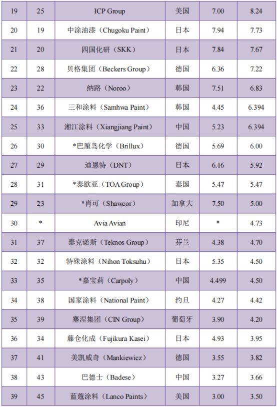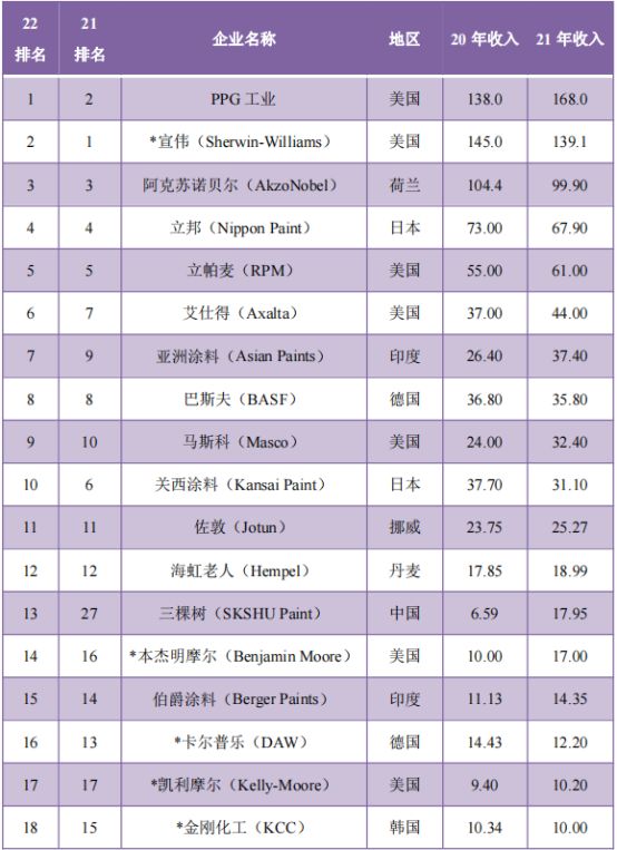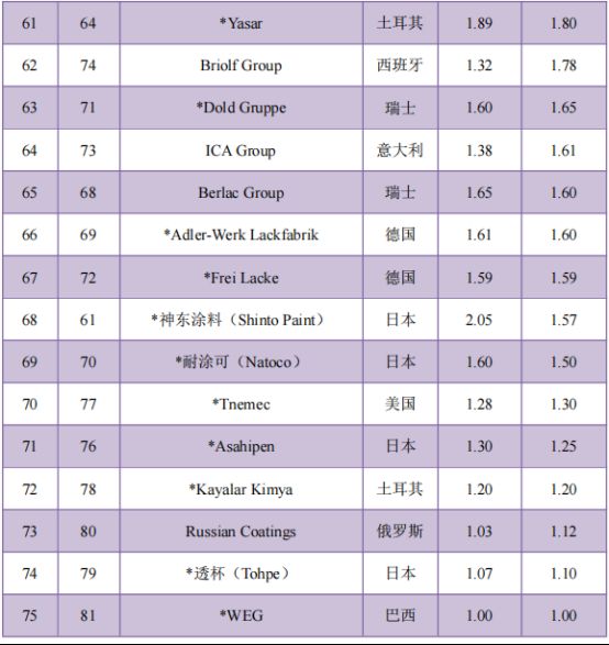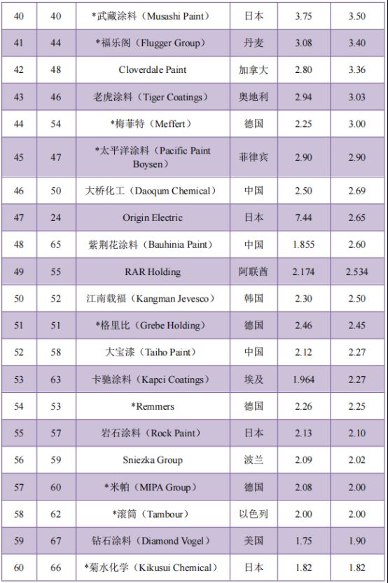 其中7家中国(包括香港和台湾地区)涂料企业跻身其中,包括排名第13的三棵树、第25的湘江涂料、第33的嘉宝莉、第38的巴德士、第46的大桥化工、第48的紫荆花涂料、第52的大宝漆,销售额分别为17.95亿美元、6.394亿美元、4.50亿美元(带*号标识表示收入额未更新)、3.66亿美元、2.69亿美元、2.60亿美元、2.27亿美元。