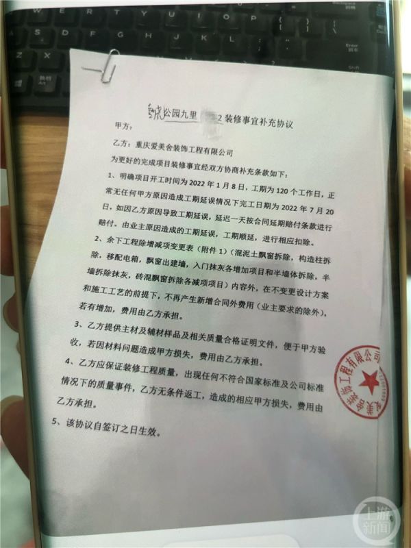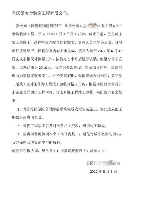 “可能就是这个补充协议惹怒了装修公司,后面的装修麻烦不断。”根据合同约定,爱美舍公司赠送彭女士30平米衣柜,但是衣柜把手等配件需要业主自行购买。于是,彭女士又付了3000元钱,然而衣柜做好后,公司却迟迟不来安装。8月5日,彭女士给爱美舍公司发出了《关于加快公园九里F7-X-X装修进度的函》(以下简称《进度函》)。上游新闻记者看到《进度函》提到:项目接近尾声,仅剩余室内衣柜未完成,贵司人员于2022年6月15日完成衣柜尺寸测量工作,按约定1个月后进行安装,但至今仍未安装,工期已滞后20余天。我方也多次催促厂家及项目经理,给出的理由为装修尾款未支付,不予安装衣柜……望贵司督促协调5个工作日内复工,避免造成不必要的损失。