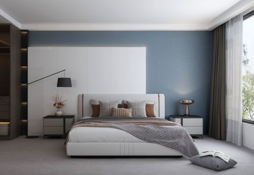 在繁忙的现代都市,一个轻松惬意的卧室能有效缓解生活和工作的劳累。湖蓝和摩卡云灰的搭配,赋予空间简单干练的氛围,半透明的白色窗纱,让慵懒惬意的