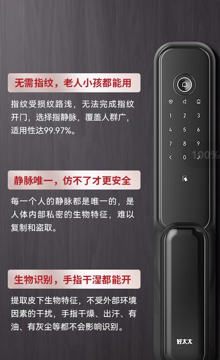2001年中国市场上出现了家用指纹锁,历经二十余年的发展,如今的智能锁发展为指纹锁、虹膜锁、面部识别锁等等,从性价比和实用性来说,指纹锁更受欢迎。但指纹锁也有不足,老年人指纹磨损严重、幼童指纹浅都容易无法录入和识别,另外生活中手指上也容易出现脏污情况,也会影响指纹锁的识别。智能锁十大品牌之一好太太智能家居于今年五月发布了智能锁系列新品V65,通过领先行业的指静脉识别创新技术,彻底解决传统指纹智能锁的痛点,守护千家万户幸福平安。