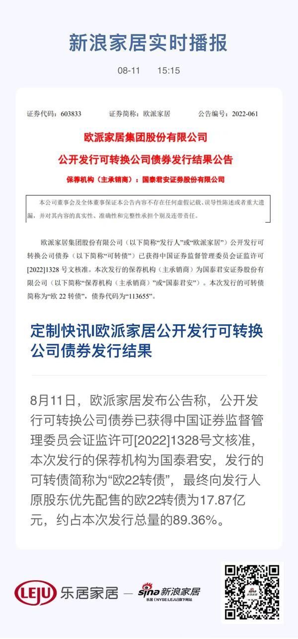 新浪定制家居讯 8月11日,欧派家居发布公告称,公开发行可转换公司债券已获得中国证券监督管理委员会证监许可[2022]1328号文核准,本次发行的保荐机构为国泰君安,发行的可转债简称为“欧22转债”,最终向发行人原股东优先配售的欧22转债为17.87亿元,约占本次发行总量的89.36%。