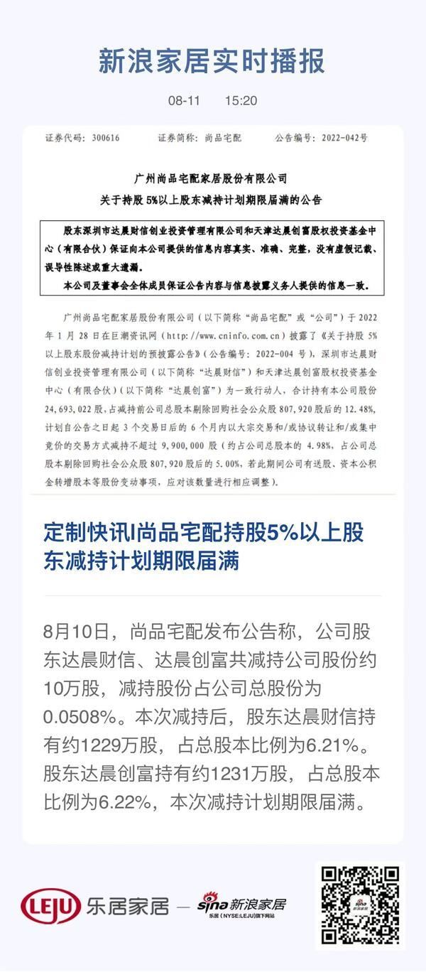 定制快讯|尚品宅配持股5%以上股东减持计划期限届满