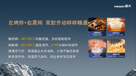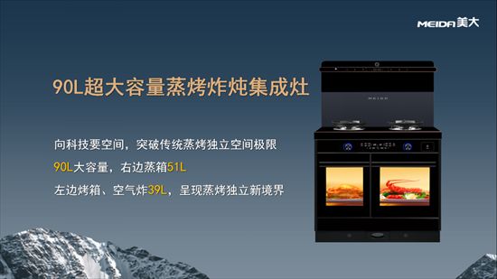 在洞察多元烹饪需求场景下,美大新品风华系列蒸烤炸炖集成灶超大内胆设计在1㎡内玩转空间,突破传统蒸烤独立集成灶容量小的空间限制,美大在内胆空间上升级研发,大胆扩容,搭载90L超大容量,左烤炸51L+右蒸炖39L,双腔齐动样样精通,把烹饪所需充分囊括,高效烹饪无需等待。美大风华蒸烤炸炖集成灶,以超大内胆,探索更多功能组合;秉创新集成,筑就烹饪新境界;方寸蒸烤领略科技演绎空间的烹饪艺术。两个人的三菜一汤不在话下,全家欢聚团圆时刻从容不迫,升阶诠释集成空间,重塑空间与时间的美感,享受多元烹饪自由。