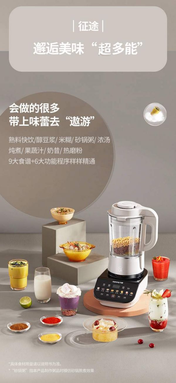 提到厨房神器“破壁机”,很多人的第一反应可能还停留在磨豆浆或者榨果汁,然而,随着小家电的更新换代升级,破壁机已经化身为“多边形战士”,集多功能于一身——九阳新推出的高速破壁料理机P557,不仅可以磨出香醇豆浆和米糊,浓汤、果蔬汁、热磨粉也不在话下,更配备了熟料快饮、高温清洗、热烘除菌和预约、调时等功能,为热爱美食的你提供了足够的发挥空间!