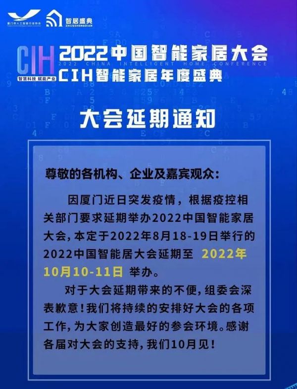 日前,CIH中国智能家居大会发布公告称,因厦门近日突发疫情,根据疫控相关部门要求,将原定于8月18日-19日举行的2022中国智能家居大会延期至10月10-11日举办。