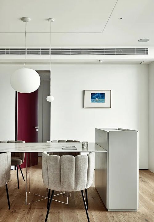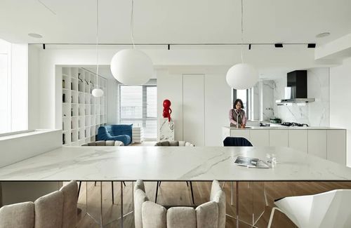 摒弃了传统客厅,餐厅,书房,厨房等各自为政的空间,把它们融合在了一起,放置了一张能办公,能喝茶,能作业,能会友的多功能大桌,一家人放下手机围坐与此,各自忙碌又能彼此互动。它既是一个大会客厅,也是一个大餐厅,更是一个大书房...