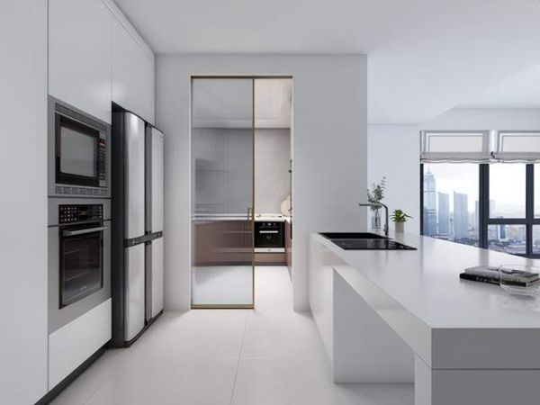 在厨房的空间,巧妙利用全景门作为开放式厨房的隔断。做饭烹饪时关上全景门,增加透光的同时隔断油烟,清洁也比较方便;平日里打开移门,使厨房和餐厅融为一体,时尚而前卫的观感扑面而来,让功能与颜值都能同步实现。