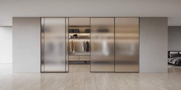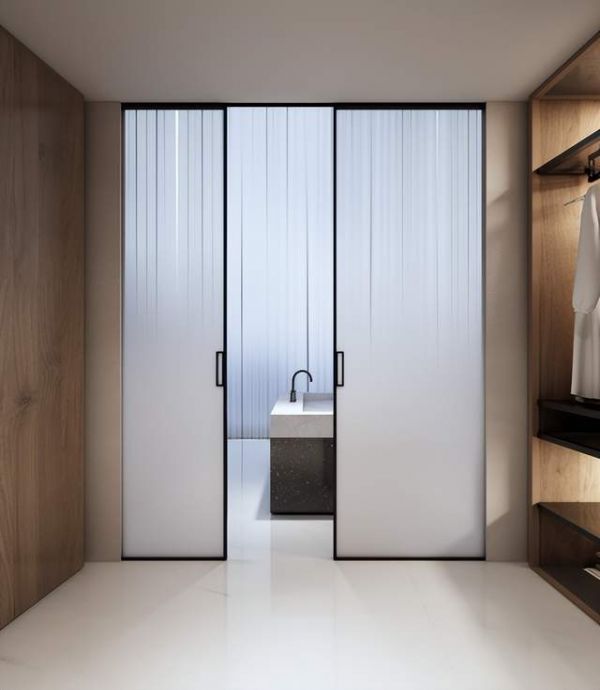 衣帽间在空间布置上兼备时尚感和舒适感,德立全景门以「雅黑边框+玉砂玻璃」的设计,既避免了衣物未及时整理而产生凌乱的不适,也保证了一定的通透性,让整个卧室展现出艺术化的魅力。