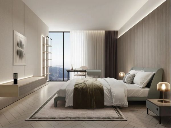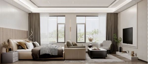 睡眠区、休闲区一体式布局,不设隔断却自有空间秩序。CBD家居·白金 | BS6029软床,素色温柔舒缓,渲染纯粹朴实的休憩氛围。绿植的存在为卧室注入盎然生机,成就一方静雅天地,独坐沉思,岁月静好。