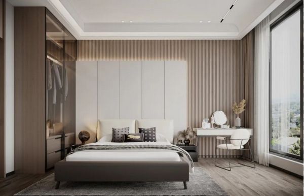 木格栅+大理石背景墙设计,暗设线灯,铺就出灵动雅致的自然质感。定制简约衣柜、梳妆台,丰富空间功能。CBD家居·白金 | BS083软床,独立米色软包挺括饱满,与整体氛围呼应,更显恬淡从容的秩序美。