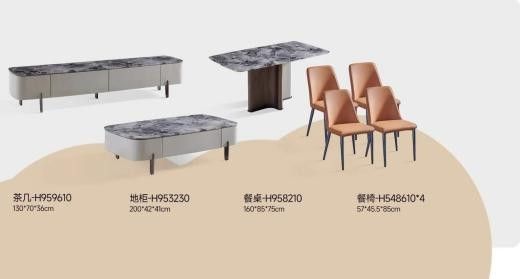 轻奢风的餐桌、椅和茶几、地柜,奢华时尚,百搭有型。纤细的桌椅腿儿,给空间带来轻盈感,是小户型空间显大的秘密。