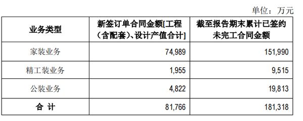 报告显示:报告期内新签订单合同金额[工程(含配套)设计产值合计]约8.18亿元,其中家装业务签单金额约7.5亿元;截至报告期末累计已签约未完工合同金额约18.13亿元。