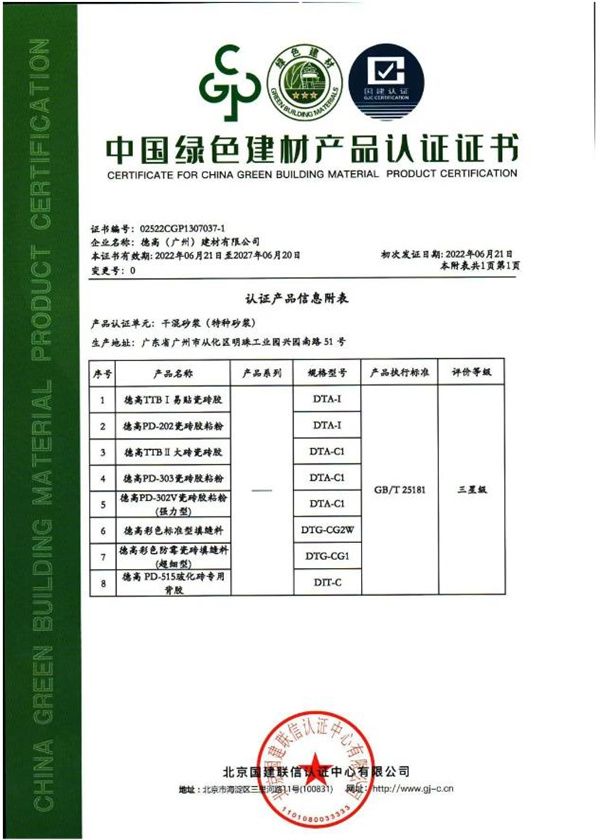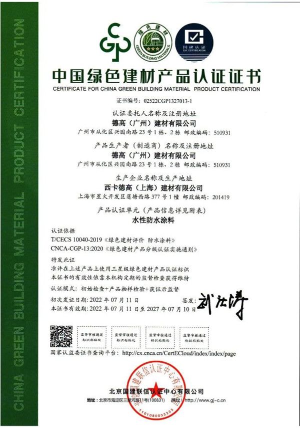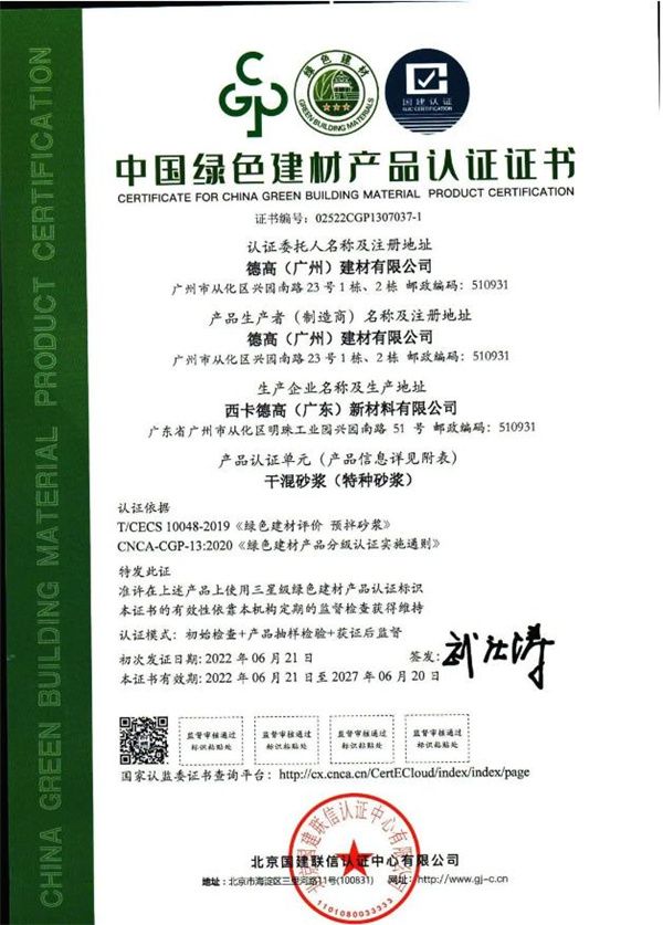 近日,西卡德高从化、上海、成都、东莞、石家庄、武汉、南京、泉州、长沙9大自有工厂顺利通过国建联信认证中心审核,荣获“中国绿色建材产品认证证书”(三星级),该级别为“中国绿色建材产品”分级认证中的最高等级。