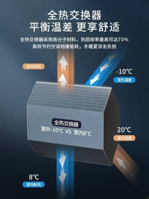 同理,在冬季则可以更大程度地保证我们的舒适度。众所周知冬季的气温非常寒冷,如果没有全热交换,那么暖气房里的热量会大量流失,并且室外的寒冷空气也会源源不断地进入室内,那么暖气就形同虚设,大大降低了我们的舒适度,而如果有全热交换,那么在室外的冷气进入室内的时候,则会从暖气房排出的热气吸入热量,从而保证我们的舒适度。