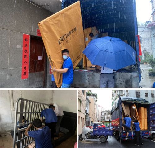 五台悬挂“库斯献爱 情满龙江”布标的爱心车队分别由社区工作人员和库斯员工分组协同,按照预定的捐赠地址、对象分五路出发,车队克服了大雨不断、道路泥泞崎岖等不便因素,安全抵达目的地,库斯员工都是通过肩扛人抬把各类家具搬运指定区域、指定房间;库斯的每一位安装技师、搬运师傅都精准作业,按照要求执行到位。