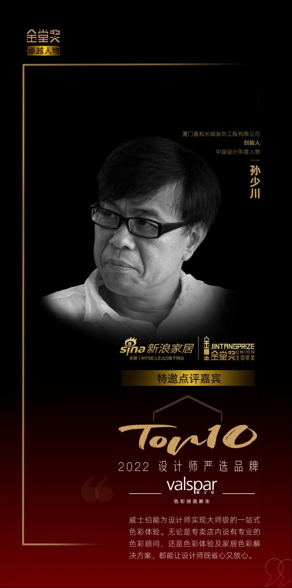 金堂奖卓越人物、厦门嘉和长城装饰工程有限公司创始人、中国设计年度人物、金堂奖全国特邀点评嘉宾孙少川对威士伯上榜表示祝贺,并点评道:威士伯能为设计师实现大师级的一站式色彩体验。无论是专卖店内设有专业的色彩顾问,还是色彩体验及家居色彩解决方案,都能让设计师既省心又放心。