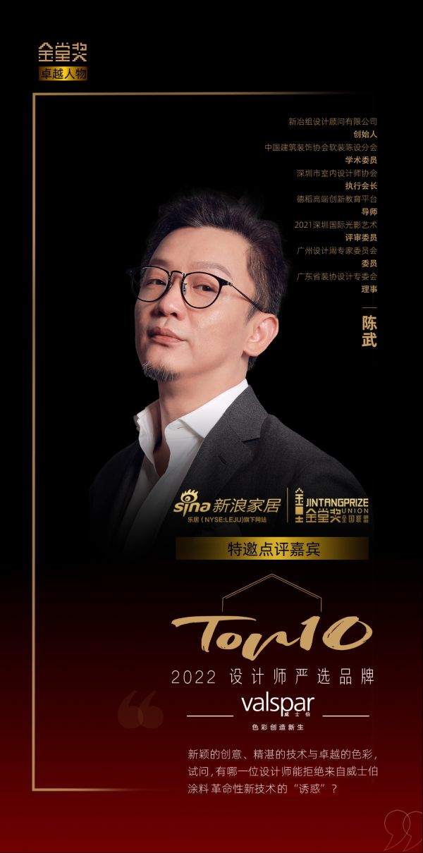 金堂奖卓越人物、新冶组设计顾问有限公司创始人、中国建筑装饰协会软装陈设分会学术委员、深圳市室内设计师协会执行会长、德稻高端创新教育平台导师、2021深圳国际光影艺术评审委员、广州设计周专家委员会委员、广东省装协设计专委会理事、金堂奖全国特邀点评嘉宾陈武对威士伯上榜表示祝贺,并点评道:新颖的创意、精湛的技术与卓越的色彩。试问,有哪一位设计师能拒绝来自威士伯涂料革命性新技术的“诱惑”?