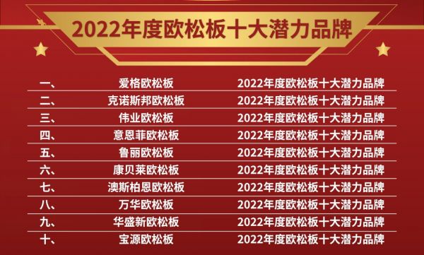 经过重重选拔审核,于8月11日尘埃落定,最终ENF级环保的伟业欧松板、康贝莱欧松板等十个品牌独占鳌头,杀出重围,成功入选2022年度欧松板十大潜力品牌!以下是入选“2022年度欧松板十大潜力品牌”榜单的企业和品牌: