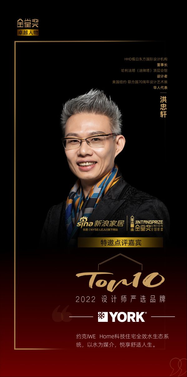 金堂奖卓越人物、HHD假日东方国际设计机构董事长、哈利法塔(迪拜塔)顶层会馆设计者、美国纽约·联合国70周年设计艺术展华人代表、金堂奖全国特邀点评嘉宾洪忠轩对江森自控约克上榜表示祝贺,并点评道:约克IWE Home科技住宅全效水生态系统,以水为媒介,悦享舒适人生。