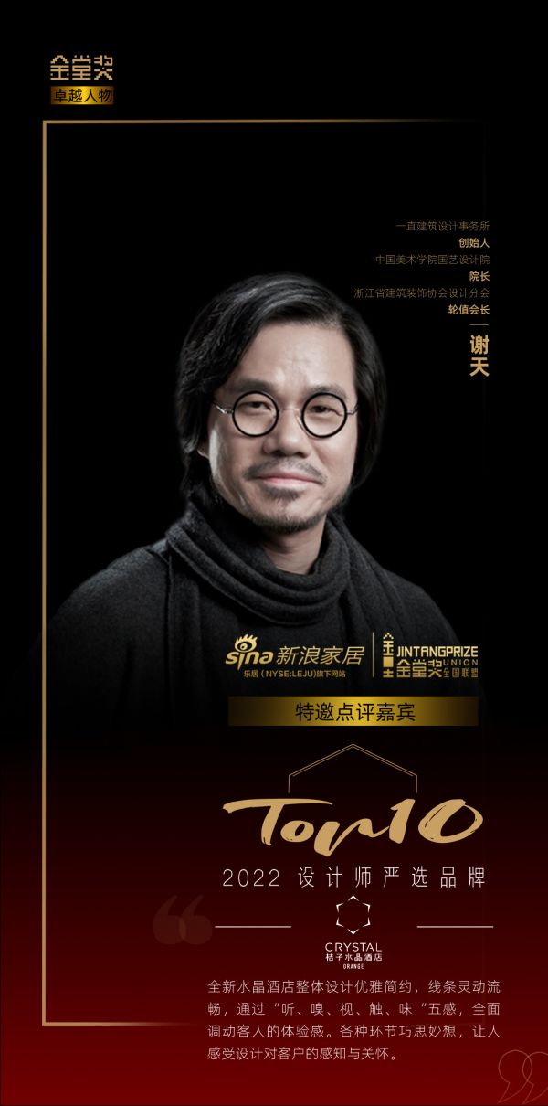 近日,由新浪家居联合金堂奖全国联盟共同发起的「2022 设计师严选品牌 TOP10」活动重磅启动,活动汇集了全国两岸三地数十位设计大咖担纲特邀点评嘉宾,并邀请全国千余名卓越青年设计师担任推荐官,以设计师专业视角,甄选出服务于设计师及业主的高品质制造品牌。桔子水晶酒店荣膺「2022 首批设计师严选品牌TOP10」称号。