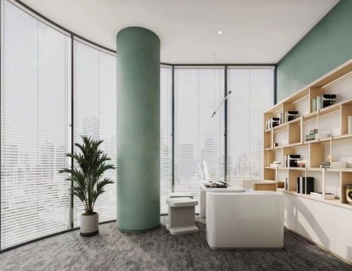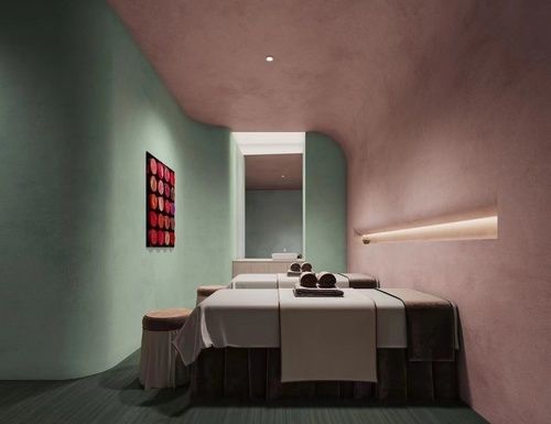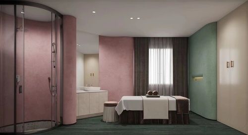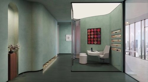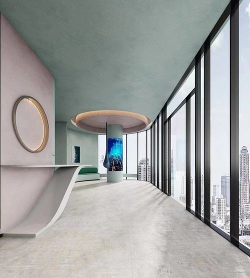 空间采用中国传统配色,水葱色地板、水色与水红围绕着整个空间。室内斗拱、墙体造出非连续段面造型,营造了一种音乐的韵律感,也有一点点神秘色彩。希望在科技医理环绕的场域,富含使人情感驰放的温柔。彷彿踏入太空或深深没入水底,由无尽的漂浮与绝对的孤立静寂组成一种恆久、无人知晓的平静。由于空间属性,照明不像其他住宅或商业空间必须全然均质明亮,或由上而下聚光直接强调某物,所以许多区块仅用最低限度的光,甚至觉察不到光的起点。它温和映衬在建筑量体的起伏错叠间隙,更让细数时间的日光流窜于狭长甬道的层层开口,引路。在幽暗的场景中,我们藉由装饰器物搭配明确亮度,让艺术成为光的发散中心、展览的核心,当光的来源从立面、从下方漾起,它不是霸道直述的功能,它变成环境、变成艺术、变成梦裡的光阴。