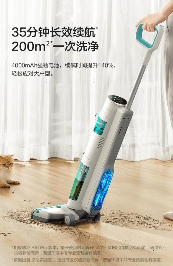 虽然增加了除菌功能,但F10 Pro除菌版的续航能力却不降反增,通过搭载4000mAh的强劲电池,可实现水电同步续航35min,较之前提升了140%,轻松覆盖200㎡大户型,20分钟就能搞定曾经需要1到2小时的全屋地面清洁,“乐活”指数直线上升。