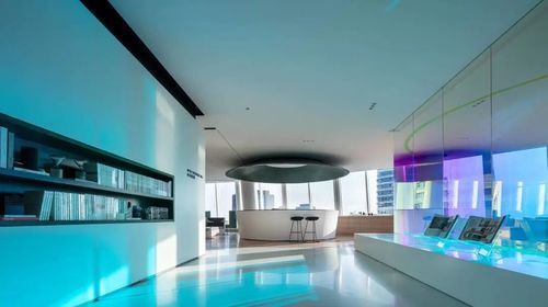 集展示、洽谈、办公、活动等功能于一体的展厅,也暗自呼应了当下城市生活的多变性,设计围绕中心轴环形展开,让城市规划、人居空间与艺术生活介入、交织,使感官变得丰富;CBD展馆中,沉浸式体验空间的明暗变化,虚拟般的镜像映照着现实的城市模型,形成一种多维度的交互体验,我们在此共同见证着城市文明与日常生活融合与共的城市新景观。