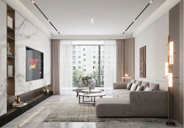 定制大理石背景墙,合理收纳置物,视觉观感更加整洁有序,双色落地窗帘、吊灯、落地灯的加持,艺术氛围感拉满,居所独有的惬意与浪漫悄然铺陈,让内心回归平静。