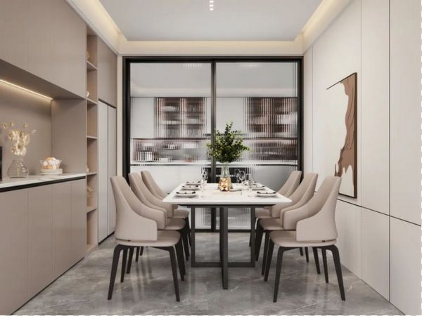 餐厨空间以长虹玻璃隔断,通透性十足。米色入墙柜,集实用性与美观性于一体,丰富空间功能。CBD家居·黑金 | HZ206餐桌,天然爵士白桌面提升空间质感,方形四角圆弧处理,温柔呵护,打造舒适温情的用餐时光。
