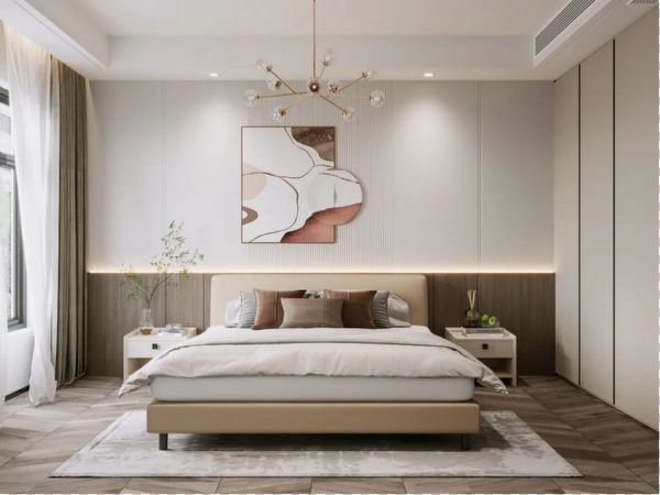 卧室注重与居主产生情感共鸣,艺术留白的格局设计更显简约轻盈。木饰板墙面与绿植呼应,别有一番幽雅风韵。