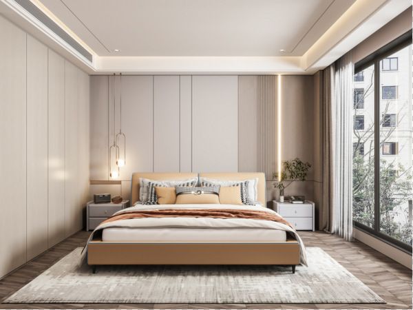 空间被浅灰咖的温馨感包裹,大片落地窗是点睛之笔,引景入室,得到更适意的生活体验。CBD家居·黑金 | HZ018软床,橡木黄色如阳光一般,让卧室充盈自然暖意,细节处间以蓝色线条点缀,彰显生活的精致感。