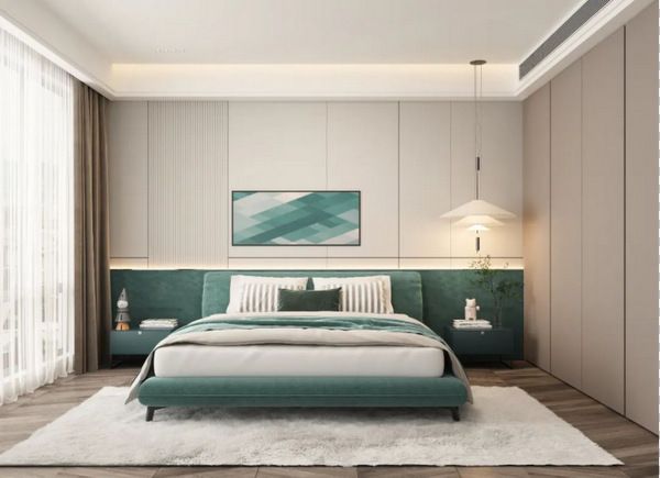 空间里的青绿色元素相得益彰,打造出静谧宜人的休憩空间。线灯与吊灯代替主灯设计,整体氛围更加舒缓浪漫,无形中安抚居主心绪。CBD家居·黑金 | HZ032软床,纤薄床身轻巧简约,放大空间感,舒享自在好眠。