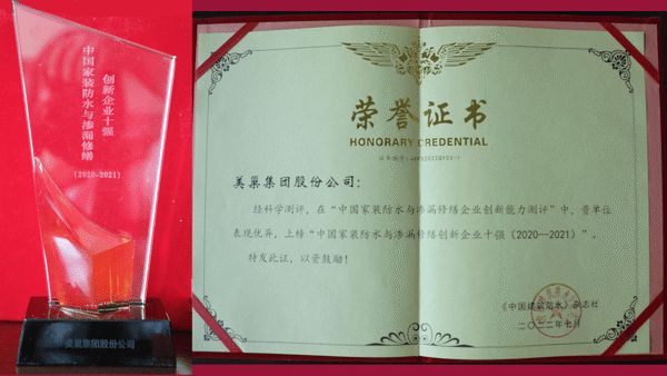 2022年7月,在慧聪防水网2022年度防水行业品牌盛会中,美巢斩获2022年度防水行业品牌盛会“家装防水影响力品牌”“防水涂料影响力品牌”双项荣誉。同月,在苏州召开的房屋建筑修缮技术论坛暨第六届家装防水技术与市场研讨会上,美巢再次在“中国家装防水与渗漏修缮企业创新能力测评”活动中荣获“中国家装防水与渗漏修缮创新企业十强”的表彰。
