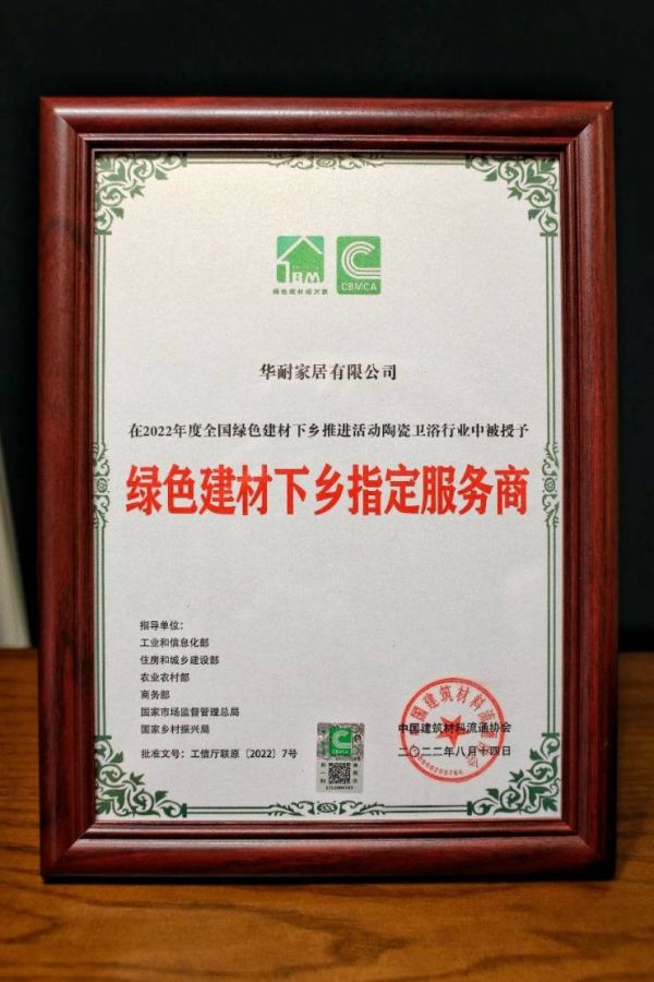 经过5-6个月的筹备,绿色建材下乡陶瓷卫浴推荐品牌及服务商名单终于正式发布。 8月14日下午,在绿色建材下乡陶瓷卫浴推荐品牌及服务商发布盛典上,中国建筑材料流通协会为各入选企业、服务商、卖场授牌。华耐家居在2022年度全国绿色建材下乡推进活动陶瓷卫浴行业中被授予“绿色建材下乡指定服务商”。