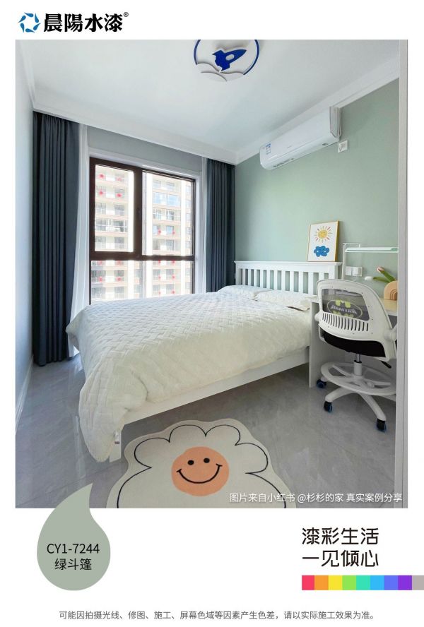 终于到了紧张又期待的墙面漆调色环节,前期通过小红书在颜色上做了很多功课,在环保漆的时候经过多方面对比,最终选择的环保口碑一直很好的晨阳水漆的天然净味荷叶水漆,因为看中了荷叶的净味可擦,最终效果也比较满意。