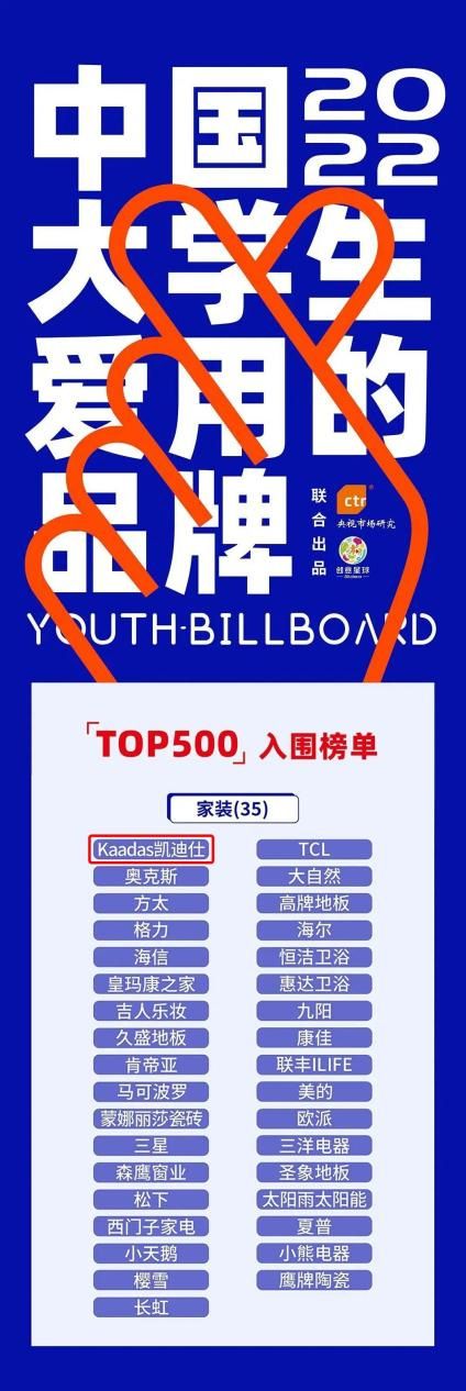 在央视市场研究(CTR)与创意星球联合调研并推出的《青年榜·2022大学生爱用的品牌》TOOP500榜单中,凯迪仕荣列家装类第一位。凯迪仕与青年受众多频次互动,构建品牌强链接,实现了青年共创与青年种草双向开花的破圈传播效果。