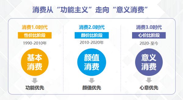 “近20年,中国消费经历了三个阶段,我们以移动互联网的发展作为一个分水岭,在移动互联网诞生之前,实际上我们处在一个全面的性价比时代,有了移动互联网之后,也就是2010年左右,大量年轻人成为了消费市场主力,这个时候大家从‘性价比’转向了‘颜价比’,所有产品设计靠‘颜值’取胜。