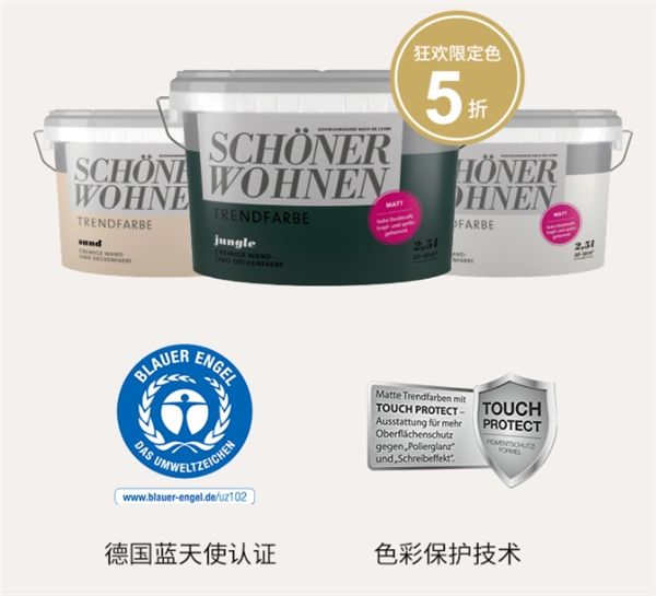 作为SCHÖNER WOHNEN-Farbe(舒纳沃恩)独家特色产品,TRENDFARBE(城市预调色) 受国内外年轻人追捧。依托总部强大的色彩研发技术,TRENDFARBE(城市预调色) 在生产线上便完成调色,无需用户进行二次调色,这样的技术避免了色差的产生,色彩所见即所得,开盖即用。且拥有独家专利技术TOUCH PROTECT(色彩保护技术),即保留了哑光的高级质感,同时提升了哑光漆耐污耐擦洗的使用性能。TRENDFARBE(城市预调色) 拥有蓝天使环保认证、绿色无添加认证等多项环保认证,可以让用户即刷即住。而这样一款进口爆品,在此次色彩狂欢季的活动中,品牌方也是给足了诚意,足见对此次活动的重视。