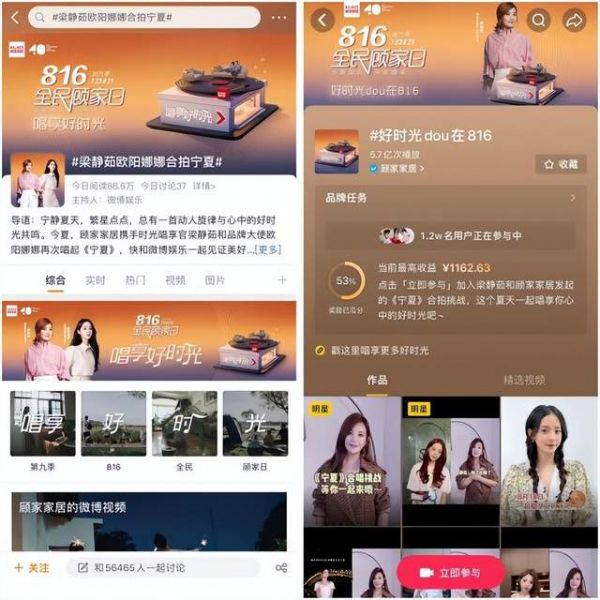 活动后期,借势经典歌曲《宁夏》,顾家家居和梁静茹一起发起的接力挑战,掀起了参与热度的高潮,千万级达人与欧阳娜娜和梁静茹隔空对唱,花式合拍。在这个过程中,顾家家居与受众在旋律中达成情感共鸣,调动着人们对“好时光”的畅想,拓宽、也潜移默化地加深了全民顾家日IP在泛大众圈层的影响力。