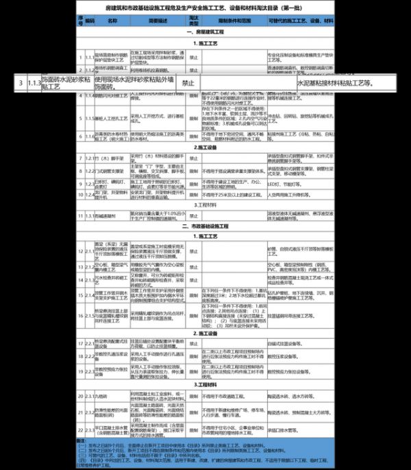 公告指出,房屋建筑和市政基础设施工程从业单位要在2022年09月14日后,全面停止在新开工项目中使用本《目录》所列禁止的施工工艺、设备和材料;2022年06月14日后,新开工项目不得在限制条件和范围内使用本《目录》所列限制类施工工艺、设备和材料。