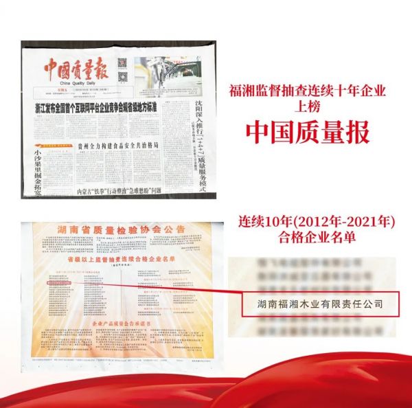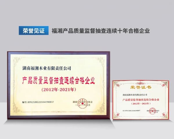 共建诚信经营,同享国品质量。近日,福湘荣获“产品质量监督抽查连续十年合格企业”奖项,标志着中国板材国家品牌的福湘迈上产品检验管控的新台阶!