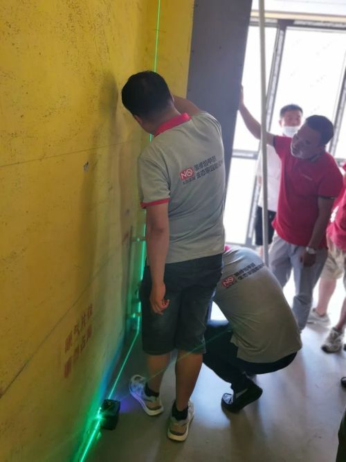 2.将方形靠尺侧面垂直粘贴墙面,以红外线影射靠尺外线进行敲打;