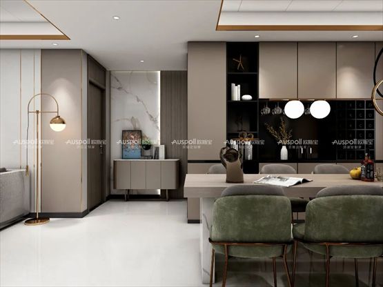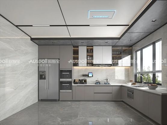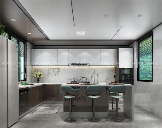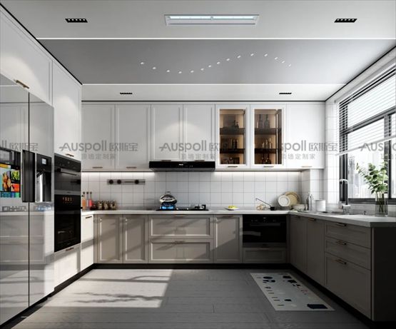 欧斯宝无界系列大板艺术拼接,结合无主灯艺术光源,简约的白色系厨房,没有过多的装饰线,营造出空间的开阔感;L型布局设计,动线合理,减少在厨房来回走动的次数。