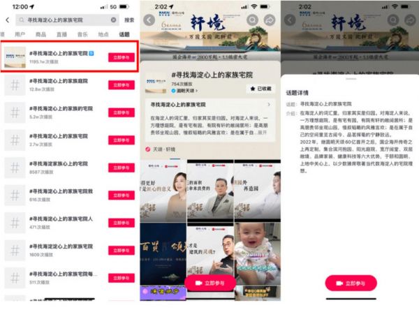双方围绕为圆明天颂的定制话题:寻找“海淀心上的家族宅院”。发动品牌与用户的多方参与,进行内容发散,吸引了1W+视频参与,带来了1192W的曝光,互动量达89.6W。
