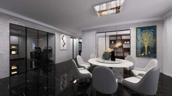 宽阔舒的餐厅空间,以简单而又明快的线条,整体色调以白、灰、黑三色为主,三种颜色的交织设计,给人内敛沉稳的视觉感。大气的圆餐桌在暖色灯光折射下冷暖相宜。精致的线条搭配,散发出空间独特的气质。