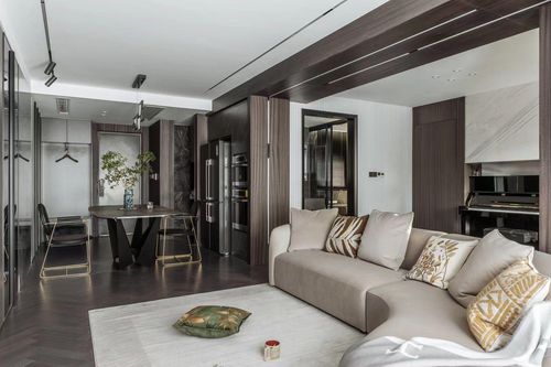本案的主题「柔之光」,实际上深色作为底色,局部的跳跃色进行点缀,营造出时尚舒适的视觉感受,整个空间以木饰面为主基调,融入岩板和玻璃材质进行混搭定制,凸显沉稳大气的定制又不乏温柔感,在“简”环境中低调的释放高级感,细腻而饱满。