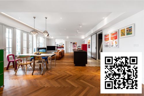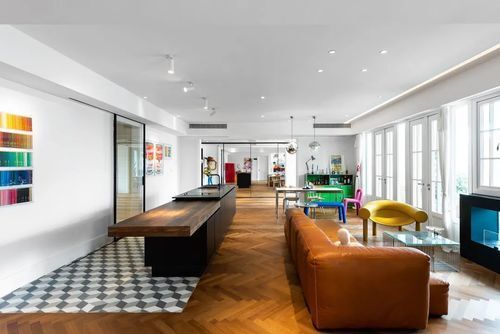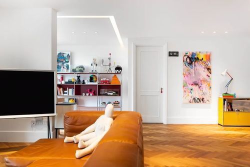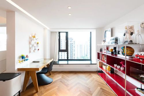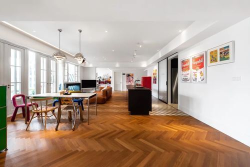 空间整体线条简约流畅,实木鱼骨拼接地板搭配颜色鲜艳的小椅凳、储物柜,都使得整体空间腔调即复古,又时尚。